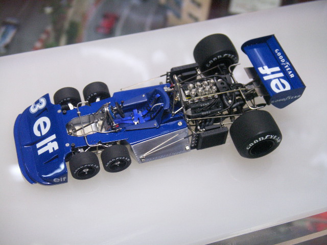 さて、お預かりした完成品は2点。当初は、F1modeling Vol.34に掲載されたベネトンB186をお借りする予定だったのですが、それに加えて「ティレルP34/2」も!そう、先日発売されたばかりのF1modelimg Vol.35に掲載されていたあのP34/2です。その素晴らしさはいまさら言うまでも無いことですが、なんと言うか、どこにも隙がないという感じで、小さな模型から大きな迫力を感じます。閉店後に、一人で舐めるように見ちゃいました