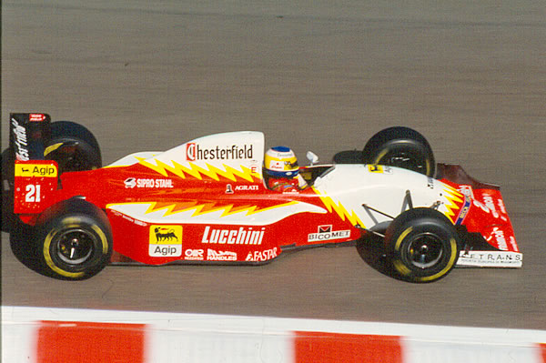 これですよ、これ。またこのマシンが好きなのよ。カラーリングがたまらない。前年までダラーラのシャーシーを使用していたBMSスクーデリアイタリアチームでしたが、93年からローラのシャーシーにスイッチ、フェラーリエンジンを搭載してこのド派手なカラーリングで走っていました。でもそうだ、資金不足で日本GPに来れなかったんだ・・・だから載っていないのね。残念。。。