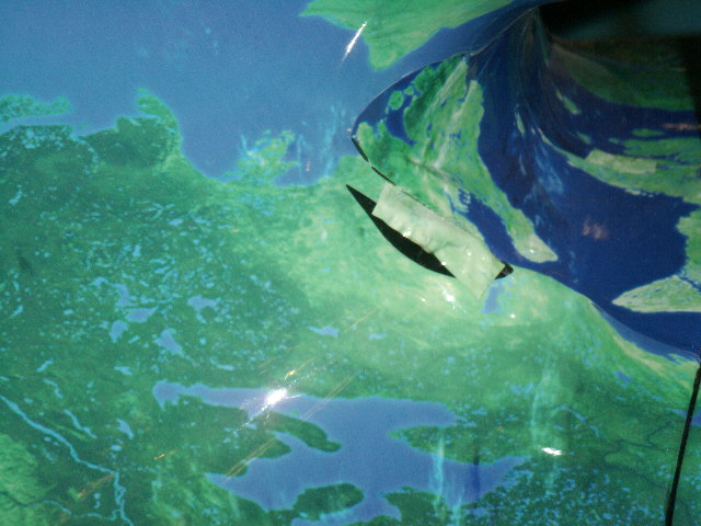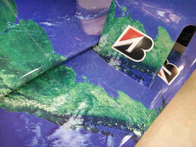 こんな感じ・・・一枚目の画像はインダクションポットの下部、かなりRがきつい部分ですが、フィルムが切れてしまったのか隙間が開き、適当に上から他のフィルムを貼ってごまかそうとしていますがごまかしきれずの図。二枚目は中央付近の張り合わせ部分にご注目。明らかに、同じ形の湖のようなものが左右に並んでいます(拡大して見てね)。3枚目はノーズコーンの接合部ですが、明らかに地形に段差が。。。やっぱりそうかあ。そうだろうとは思ったけど。実車はもっとRのきつい面構成ですから、さらに大変なことは想像付きますね。もちろん、目の前の車はあくまでショーカーですから、適当に貼ったのかもしれませんけど。。。だって、