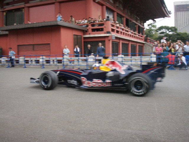 浅草と言えば浅草寺。今回のイベントも、浅草寺で「日本GPでの安全と入賞祈願」をレッドブルチームが行う」と言うのがそもそもの趣旨で、そのついでに浅草寺前の仲見世通りなどをパレードして、実車もお披露目するとの内容でした。「入賞祈願」ってのがちょっと現実主義的でオカシイね(笑)。「優勝祈願」でいいのにね。
