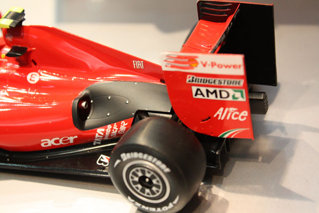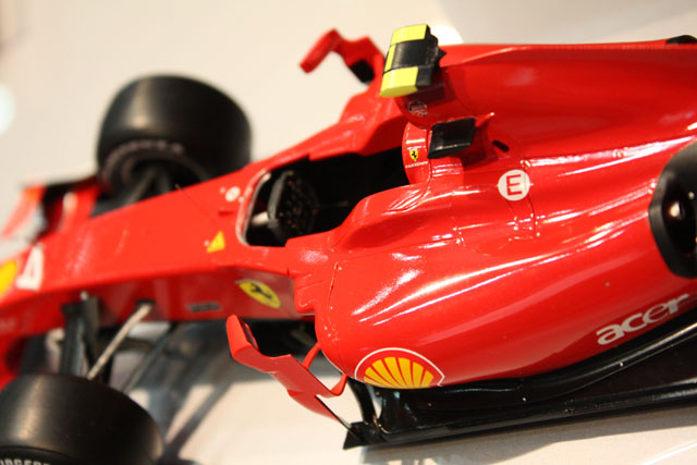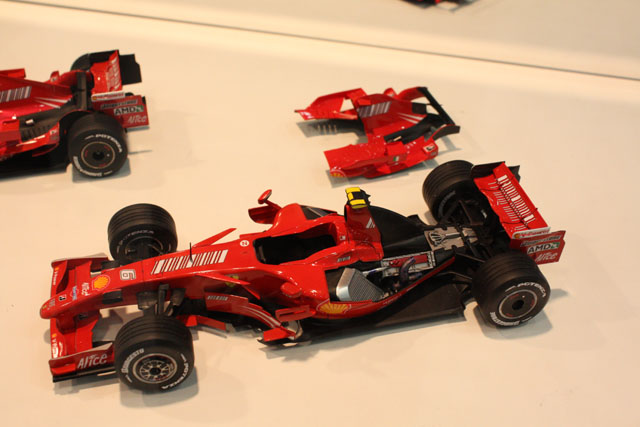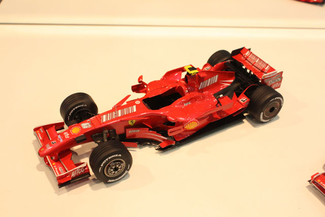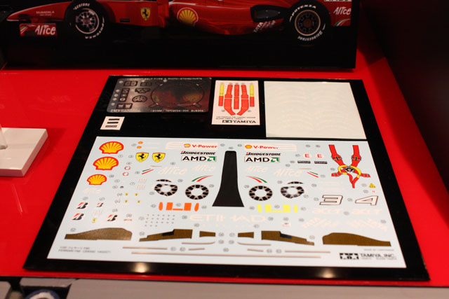F2007です。これもまあまあカッコイイ。でも、パーツやデカール展示が一切無い。なんで?一緒に飾られていたMP4/6は明らかにキットそのままではなかったので、なんか不安。キットが入荷するまで、詳細は分からないですねえ。何気にバーコードデカール貼ってあるし。キットに付属するハズはないよねえ?別売りエッチングの展示も無かったなあ。。。