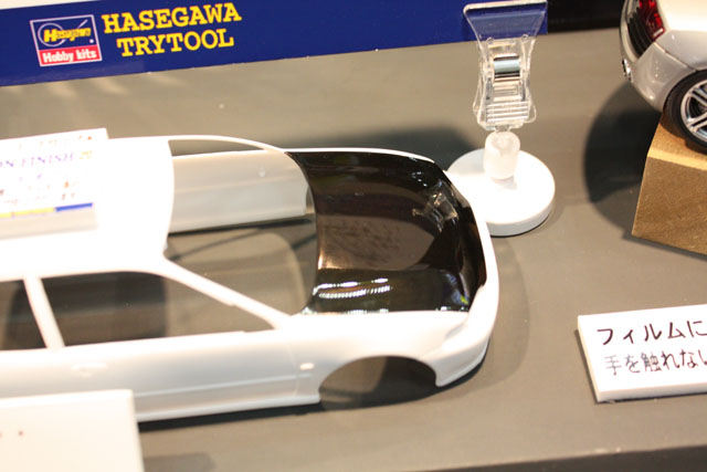って良く分からないですよね。ハセガワの「カーボン・フィニッシュ」です。既に発売されている「ミラーフィニッシュ」などのシリーズで、厚みは僅か20~25ミクロン。真剣に見入っていたら、ハセガワの人が「貼ってみてください」と台紙から剥がしたサンプルをくれたのですが、貼るべき適当なものがなく、持っていたデジカメに貼ってみましたよ。出来るだけ曲面になっている部分に貼ってみましたが、指で伸ばすだけでシワにもならずピッタリ!おお、すげ~!!