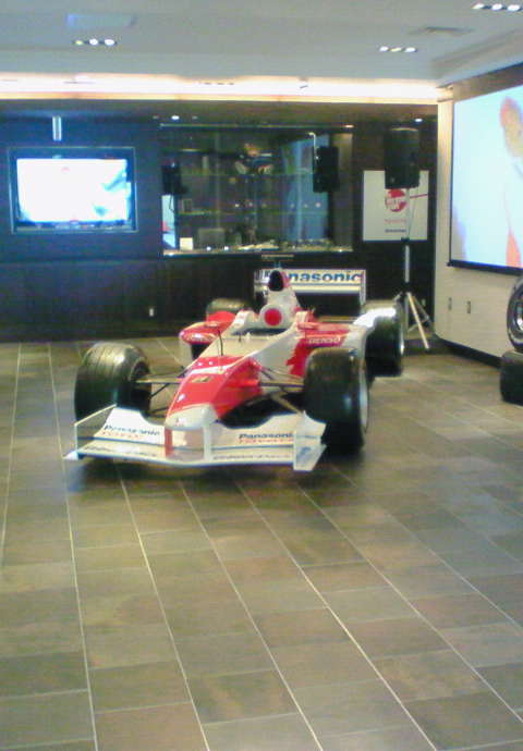ヤルノとグロッグのドライバーネームが貼られていましたが、TF102ですね。なんでまた、そんな古いマシンを引っ張り出してきたのかはよく分かりませんが、柵も何も無く、写真は撮り放題だし、触っても何も言われませんでした。デジカメを忘れたのが悔やまれましたが、既にTF102は作ってしまったし、もうキットが無いのでまあいいや。しかしあんなに無防備で良いのかな?酔っ払って乗ろうとする奴とか、絶対いそうだと思いますが。あ、だからこそTF102なのかなあ。